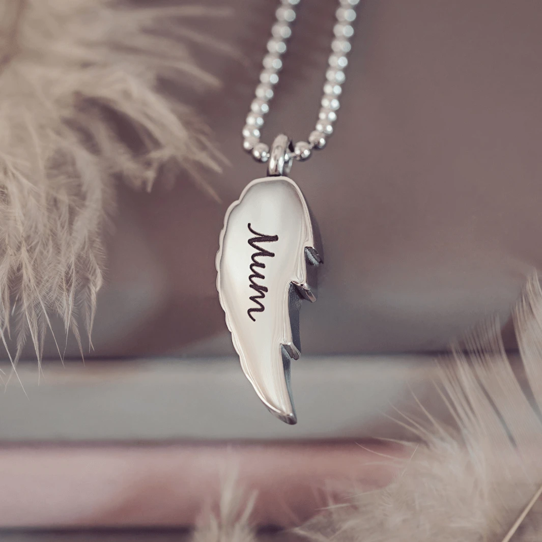 Introducing our Angel Wing Urn Necklace, a beautiful and meaningful way to cherish the memory of a loved one. Crafted with care from high-quality stainless steel, this pendant is not only an exquisite piece of jewellery but also a personal keepsake. It can be engraved with a name or date that holds deep significance for you. Inside, you can safely preserve a small portion of your loved one’s ashes, and we provide the necessary tools and step-by-step instructions for you to do this comfortably at home, or you can choose to supply the ashes to our studio so that we can fill the piece for you.