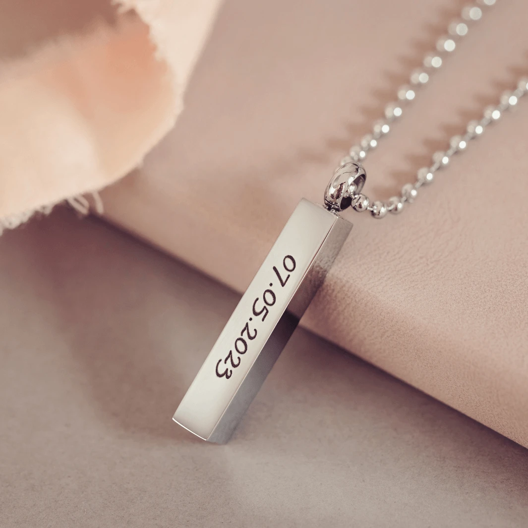 Introducing our Cremation Ashes Bar Necklace, a timeless design created so that you can carry your loved ones close, always. Crafted with care from high-quality stainless steel, this pendant is not only an exquisite piece of jewellery but also a personal keepsake, the embedded gemstone giving an added touch of sparkle. It can be imprinted with a name or date that holds deep significance for you. Inside, you can safely preserve a small portion of your loved one’s ashes, and we provide the necessary tools and step-by-step instructions for you to do this comfortably at home or you can choose to supply the ashes to our studio so that we can fill the piece for you.