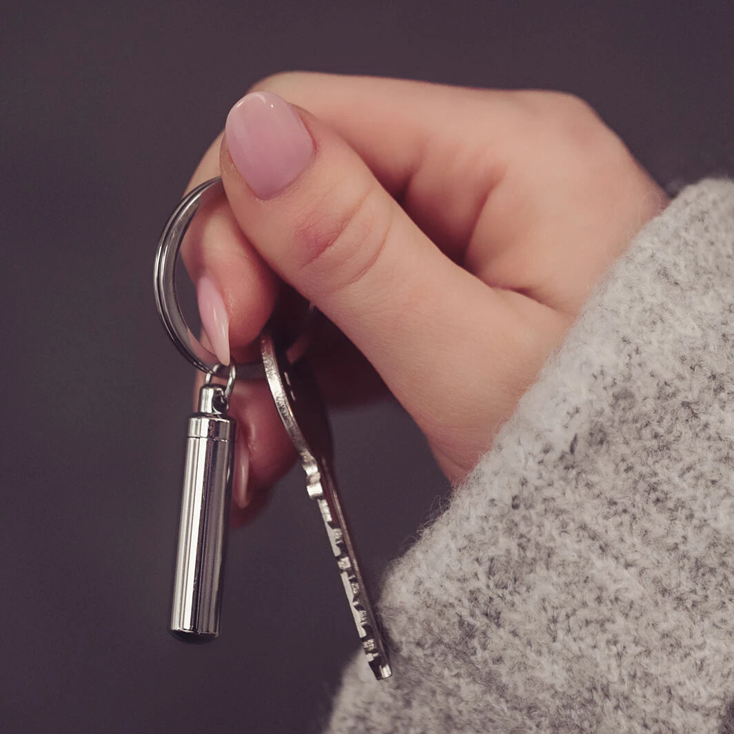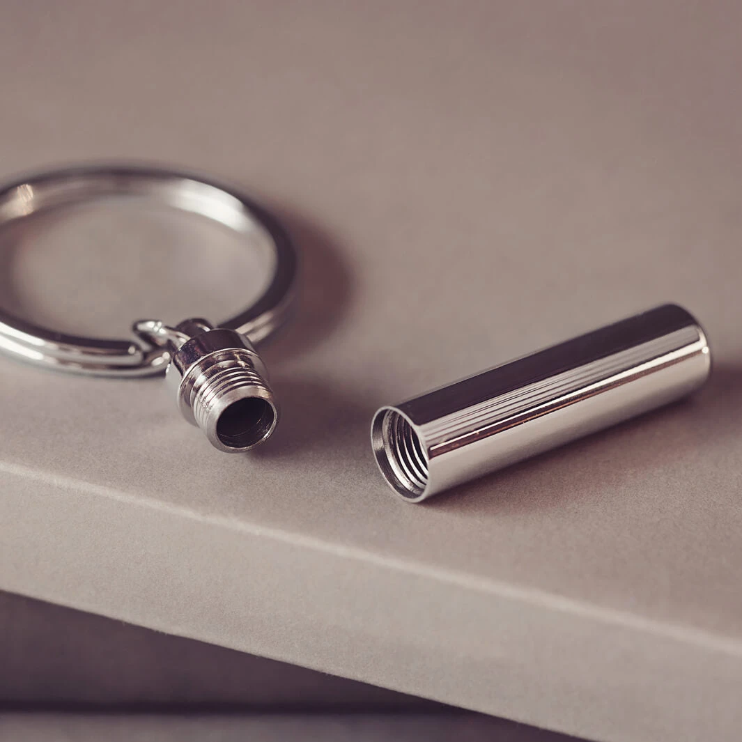 *Brand New Design* Our discreet Cremation Ashes Legacy Keyring is the perfect way to carry your loved one with you always. This stylish keyring is crafted from Stainless Steel and is designed to be filled with a small token of ashes or hair from your loved one – we provide the equipment and instructions needed to do this at home or you can choose to supply the ashes to our studio so that we can fill the piece for you.