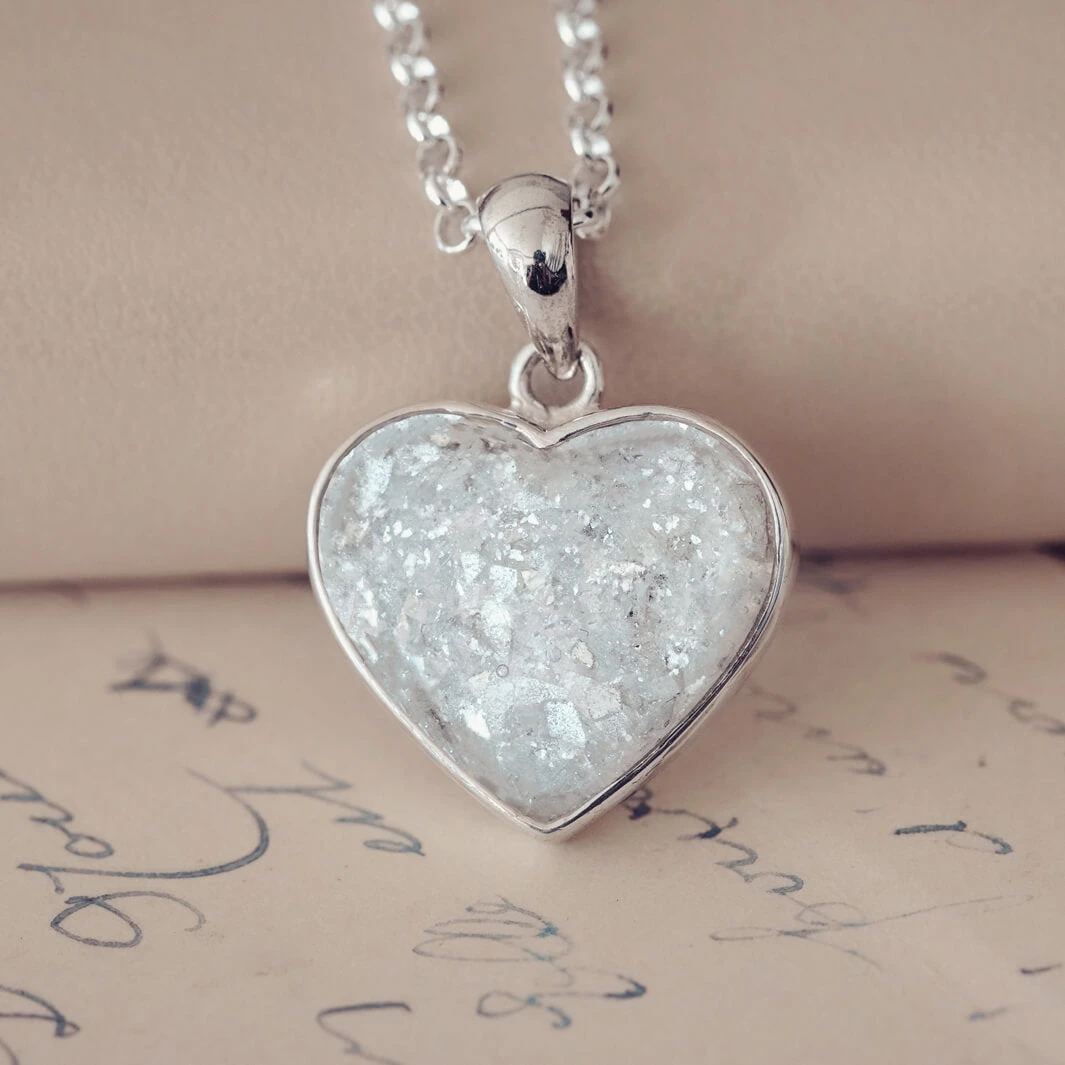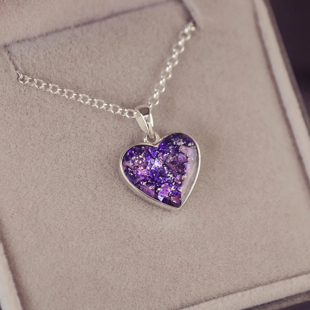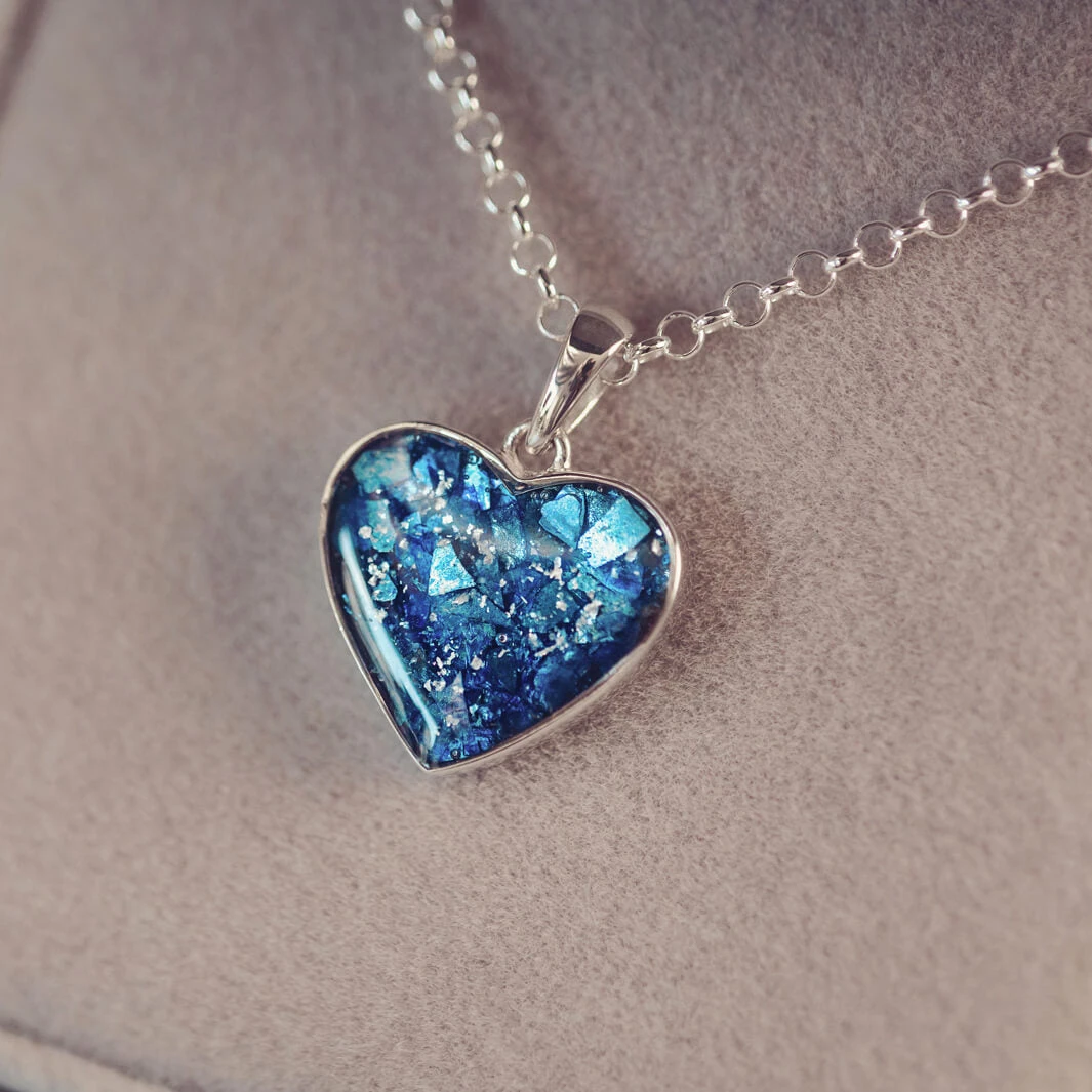 Crafted with love, this elegant, heart-shaped necklace features cremation ashes from your dear one. The pendant, made of sterling silver, is meticulously layered with a resin blend containing the ashes. Available in a multitude of colours, the pendant is accompanied by a sterling silver chain that can be adjusted between 16-18 inches. Additionally, the piece comes with a certificate of authenticity and is elegantly packaged in a beautiful gift box.