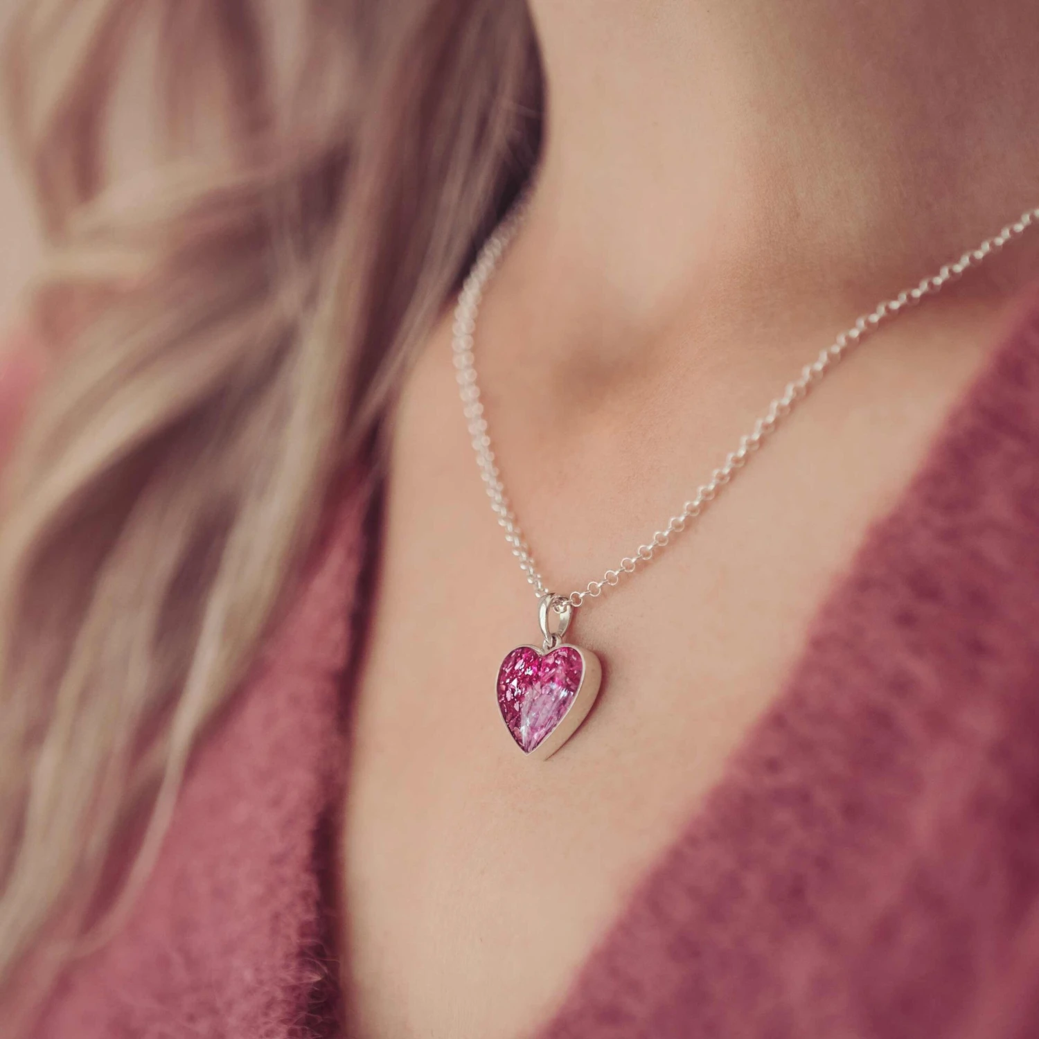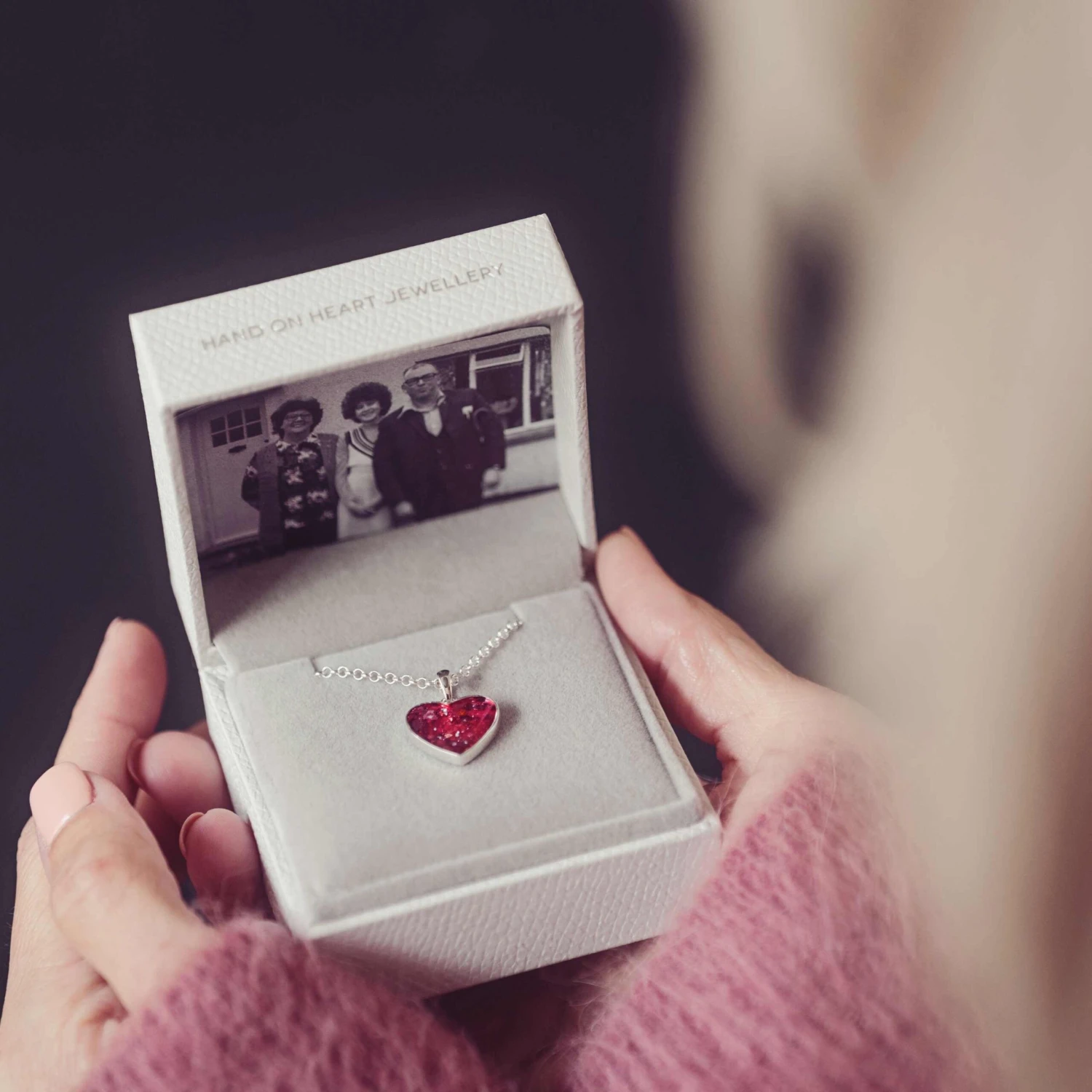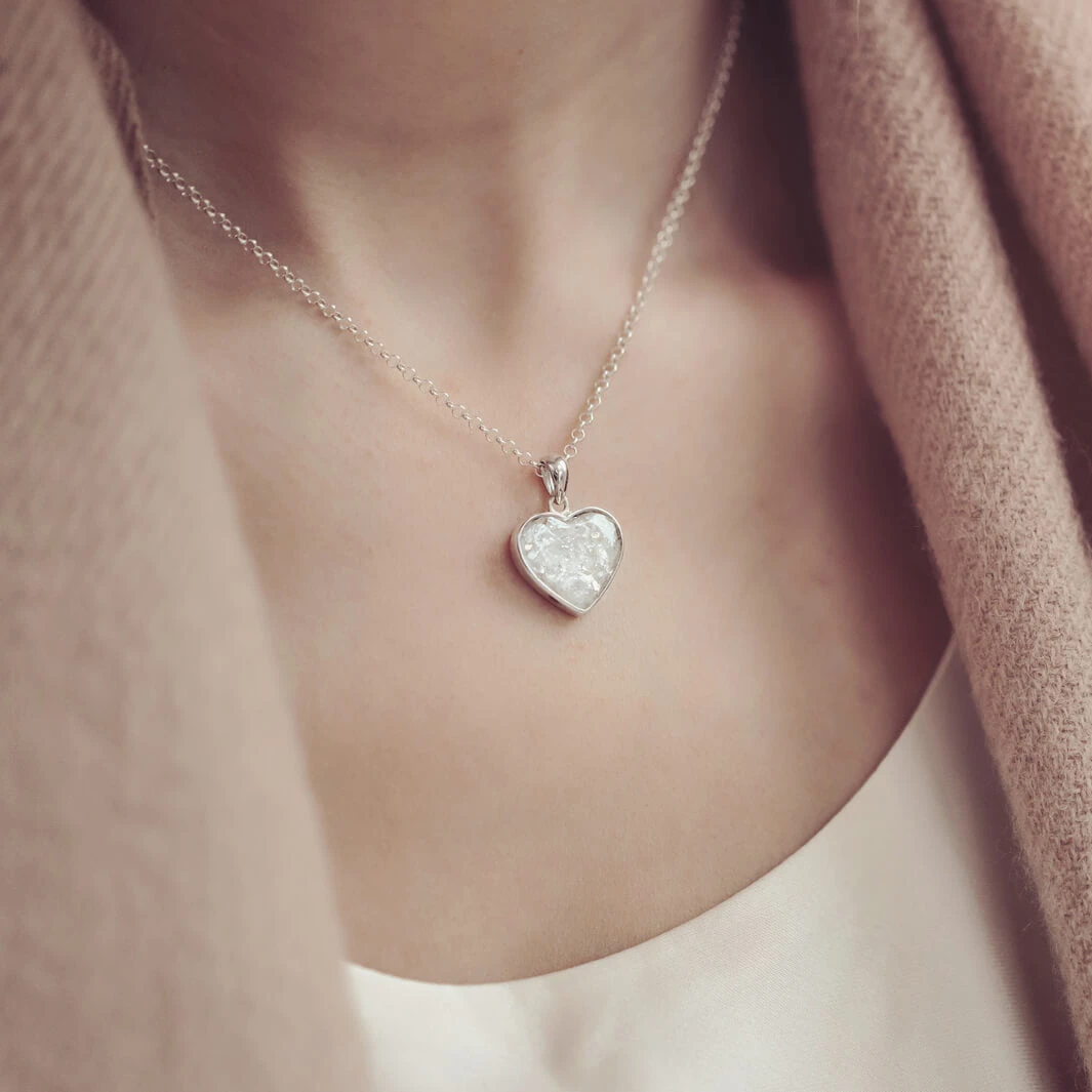 Crafted with love, this elegant, heart-shaped necklace features cremation ashes from your dear one. The pendant, made of sterling silver, is meticulously layered with a resin blend containing the ashes. Available in a multitude of colours, the pendant is accompanied by a sterling silver chain that can be adjusted between 16-18 inches. Additionally, the piece comes with a certificate of authenticity and is elegantly packaged in a beautiful gift box.