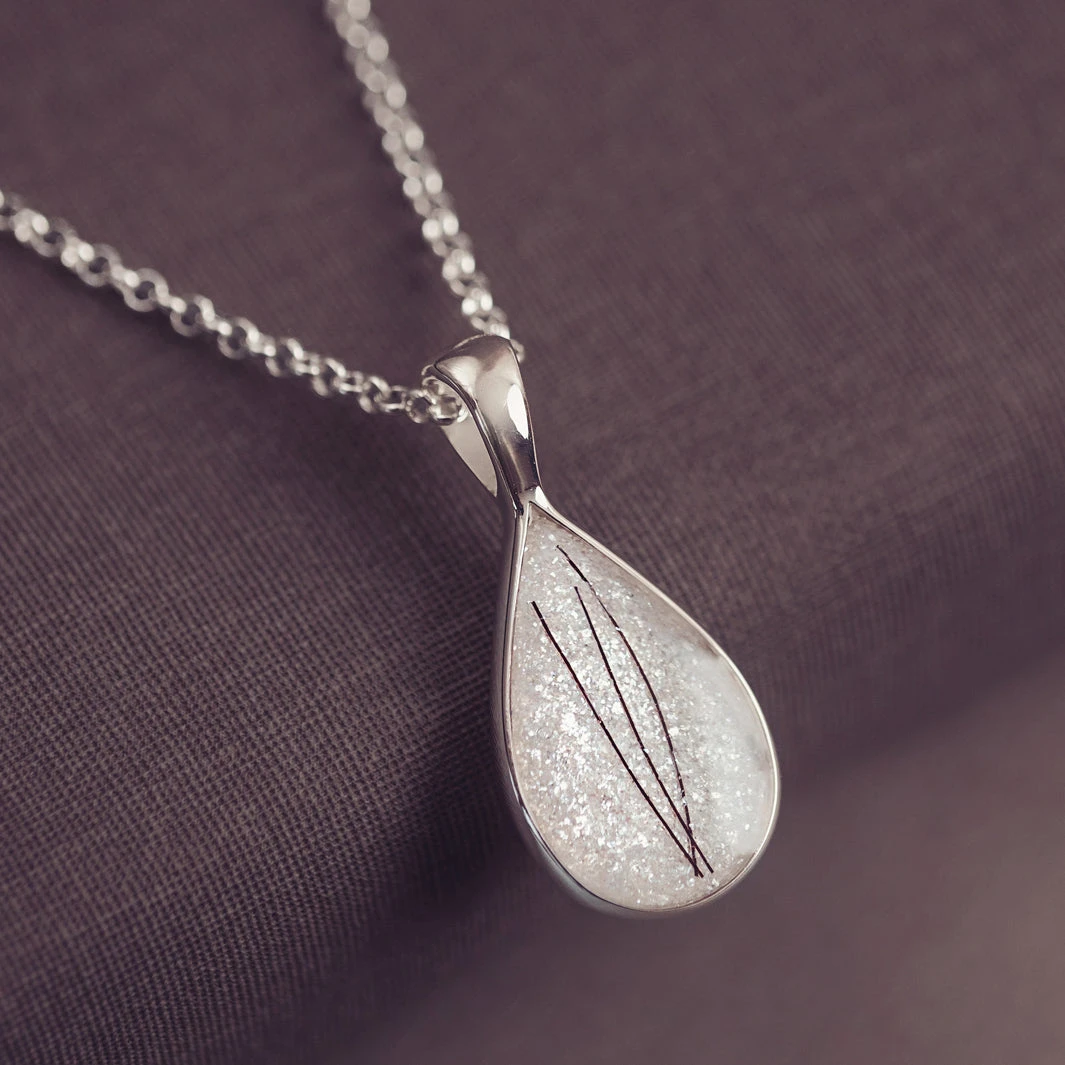 A beautiful Teardrop Necklace created using a lock of your Horses Hair, Mane or Tail. The sterling silver pendant is carefully layered with resin containing the hair to achieve a beautiful floating appearance. Available in three different colours, the pendant comes complete with an 16-18″ sterling silver chain, an authentication certificate and beautiful gift box. The reverse of the necklace can be engraved with a name or personal message of your choice.