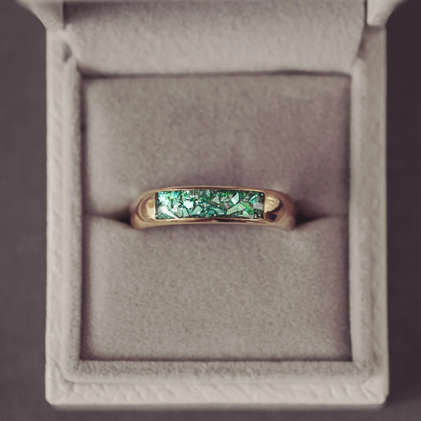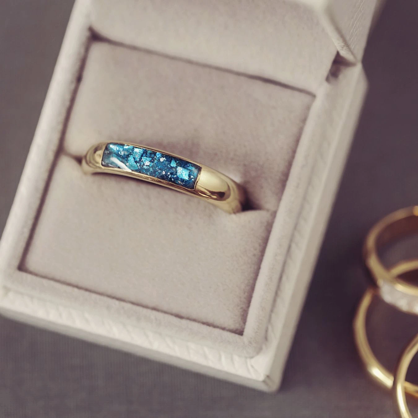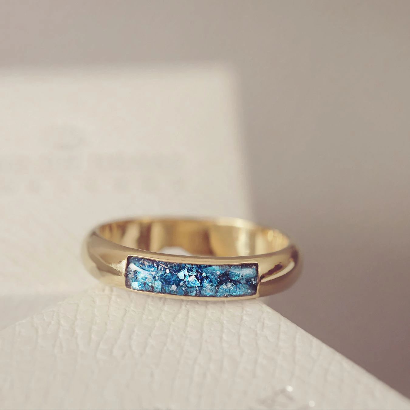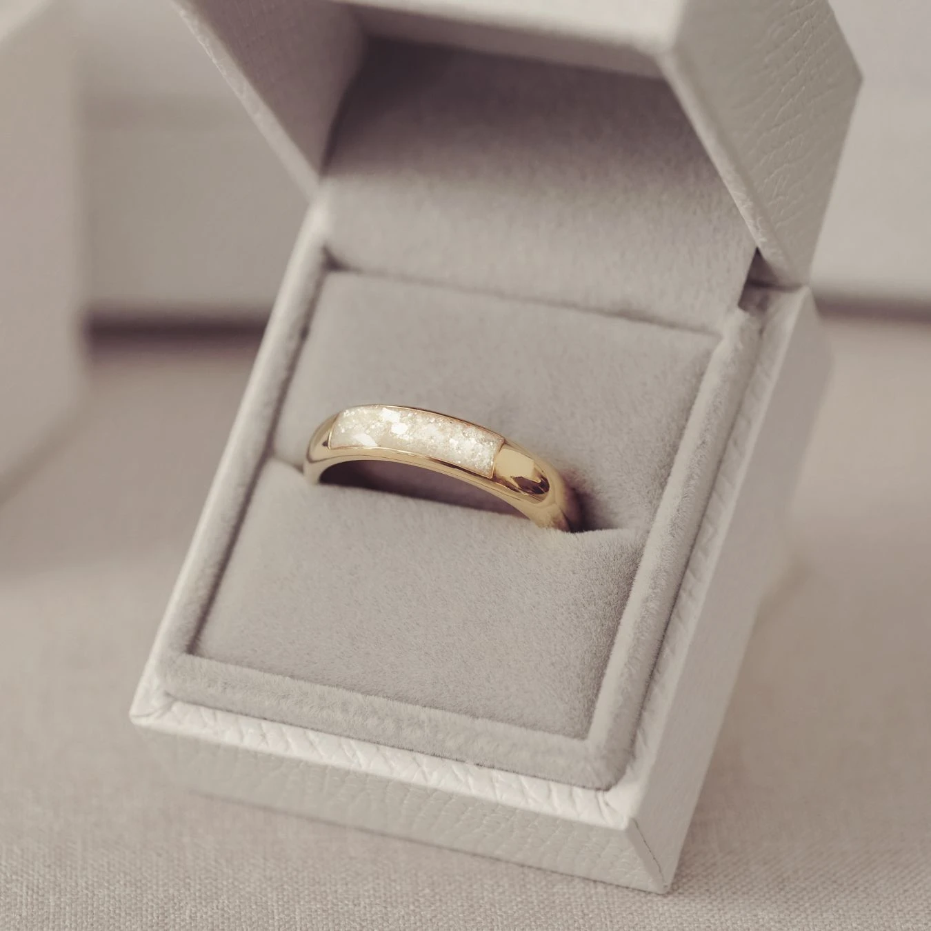 A section of the band is delicately inlaid with our signature floating ashes, coloured in the shade of your choice.